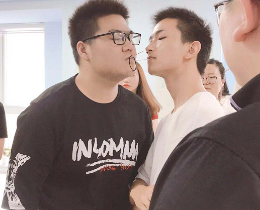 这个游戏要保持平稳,不要慌,自然不会掉。但是场上干扰太多,总有人在逗人发笑。有小组没有控制住情绪,惨遭淘汰。