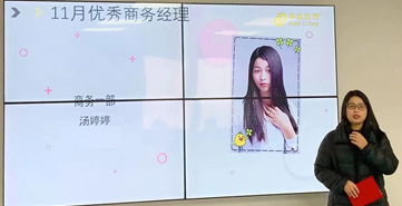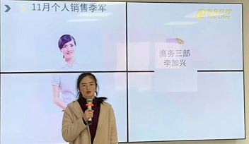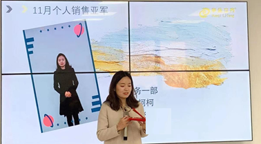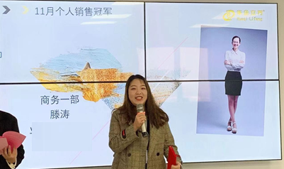 11月销售大会个人冠军是商务一部的滕涛。她是当之无愧的华企一线领军人物,作为榜样她学习改变争取赢的结果,持续不断做好每个细节,她永远都在大家的注目中。