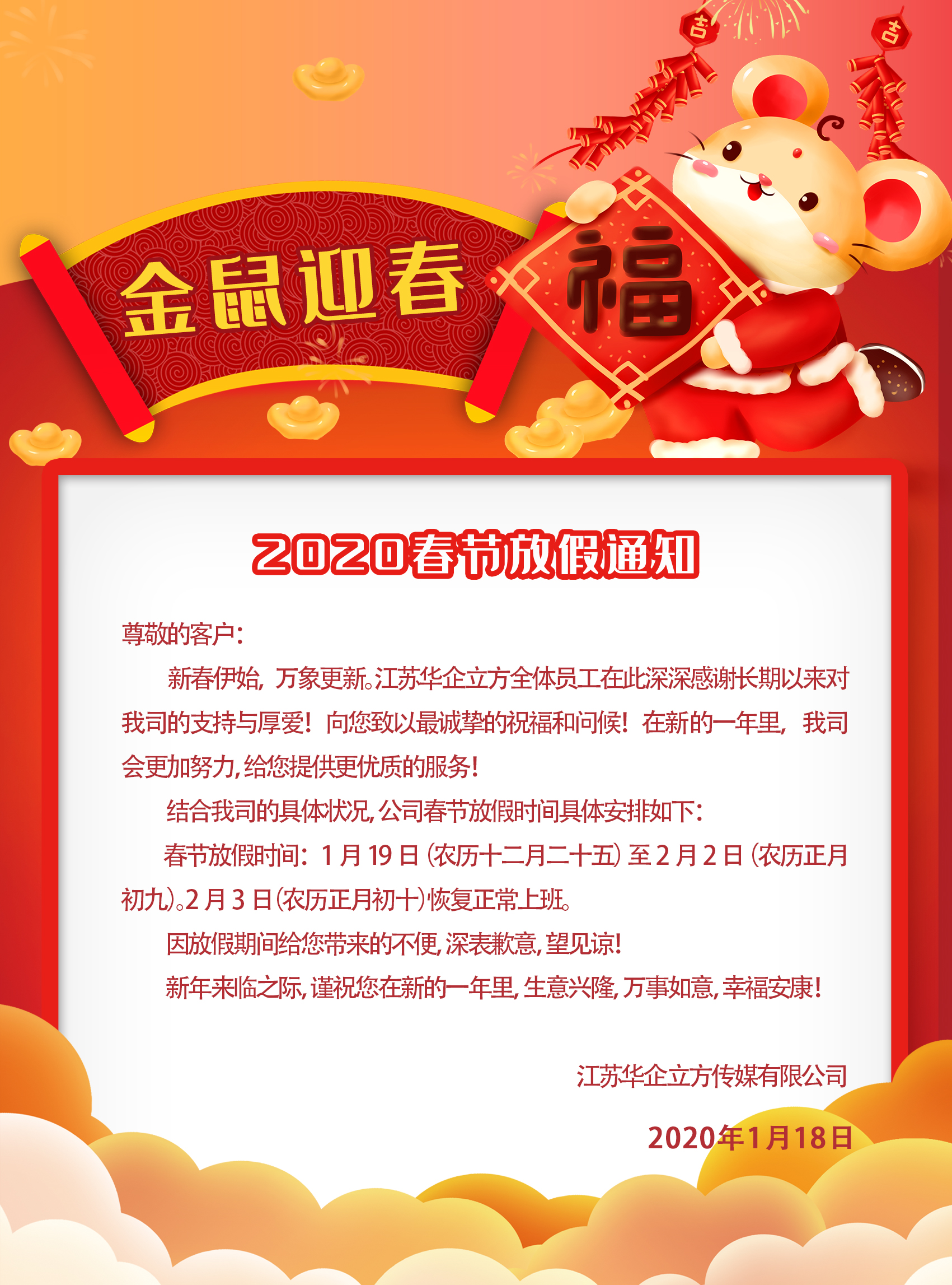 正值中国的传统节日“春节”来临,在此向各位新老客户和广大朋友们拜个早年!预祝大家新春愉快!财源广进!事业红火!